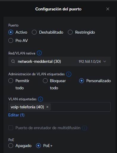 VLAN de datos: “network-meddental” configurada como nativa (untagged).